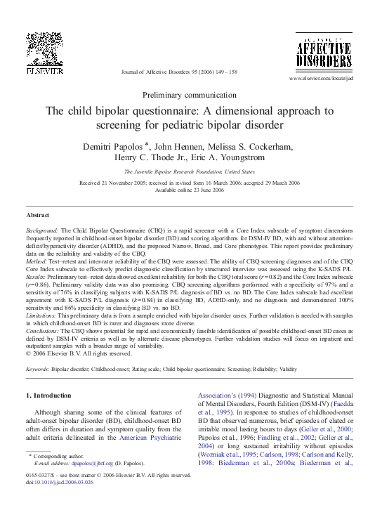 Pdf The Child Bipolar Questionnaire A Dimensional Approach To Screening For Pediatric Bipolar Disorder Demitri Papolos Academia Edu